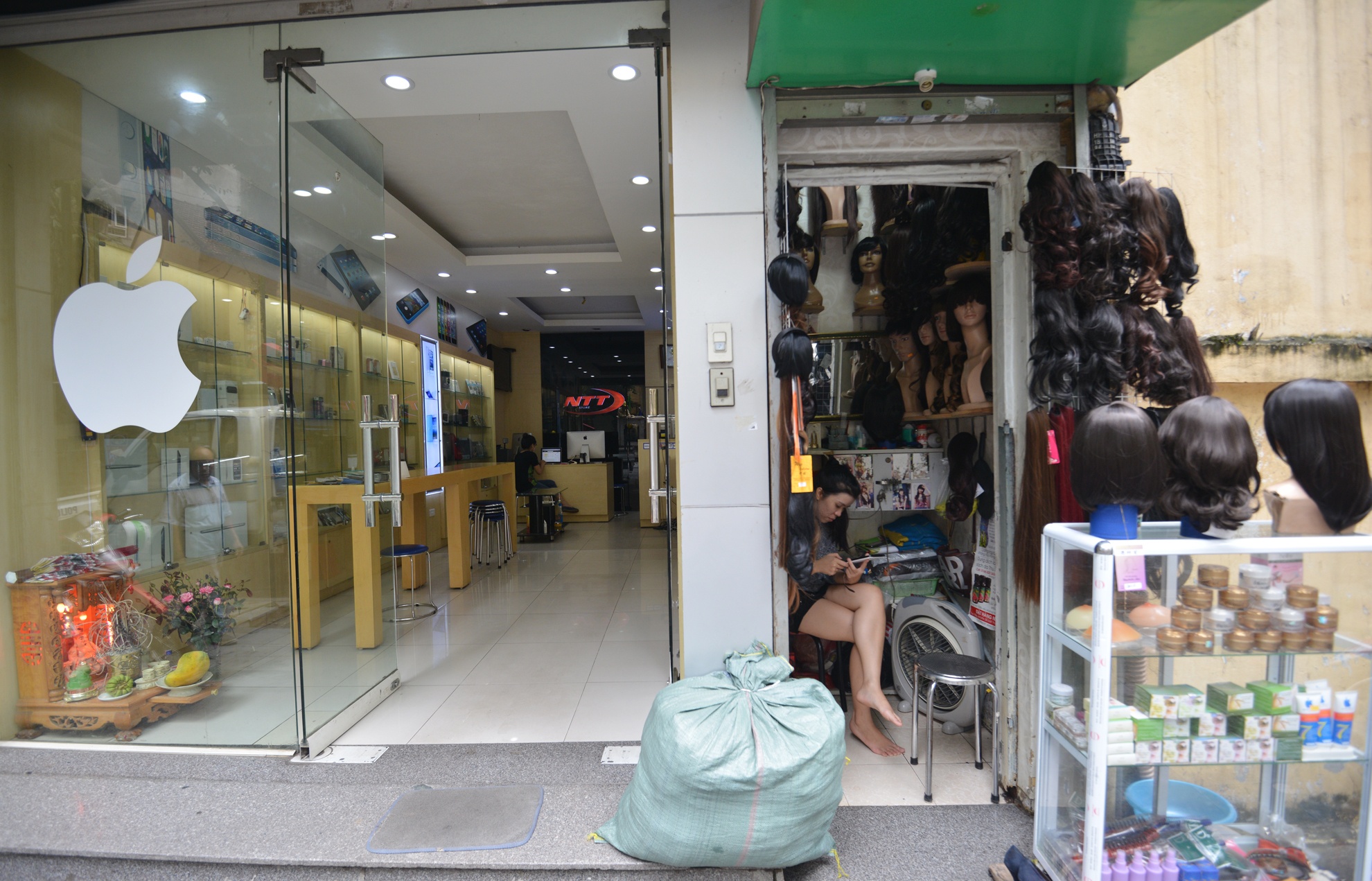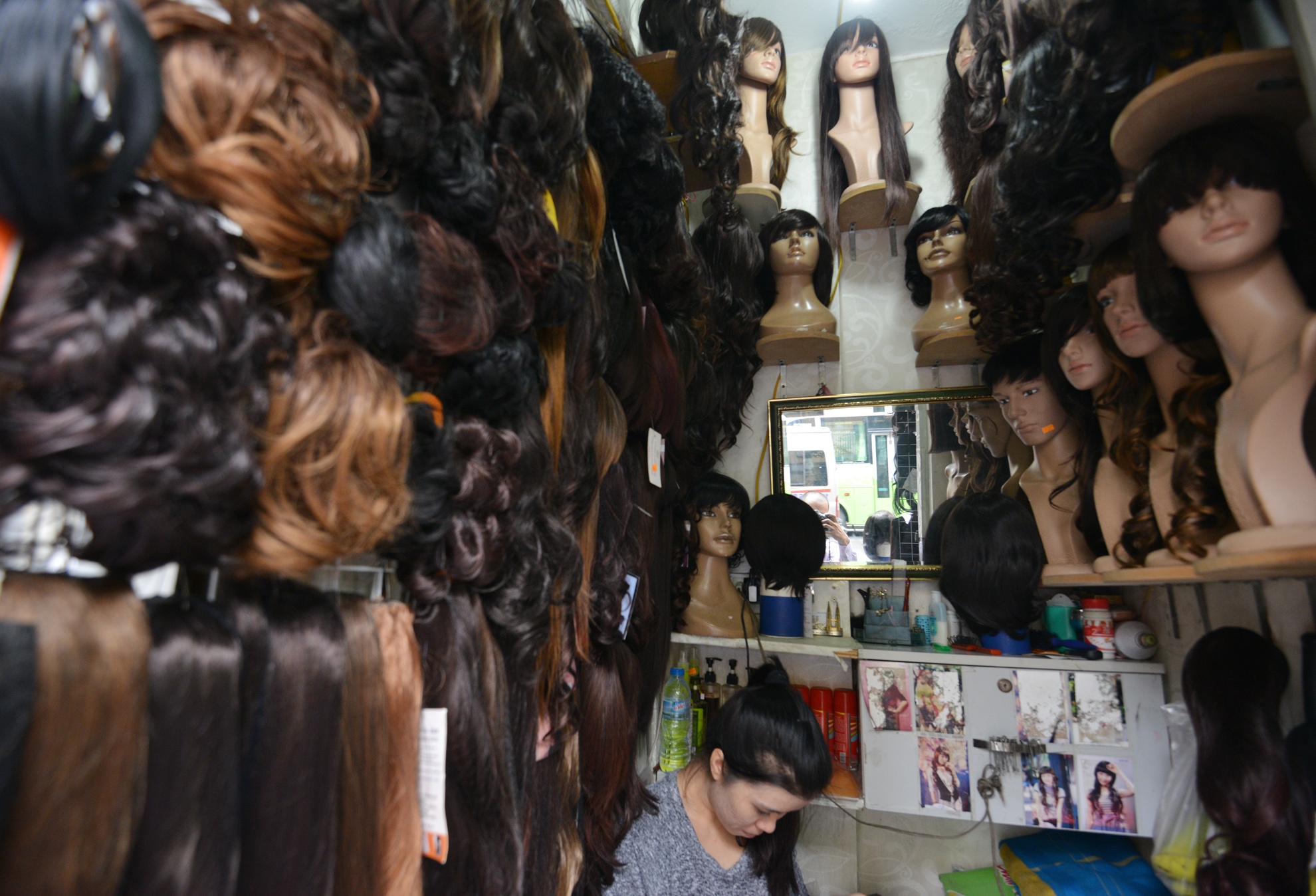 Hàng tóc giả nằm trên phố Tràng Thi (quận Hoàn Kiếm) cũng chỉ rộng gần 1,2 m2. Do diện tích quá nhỏ nên hàng được treo trên một chiếc khung nhỏ gắn xung quanh tường, góc nhà đặt một chiếc ghế nhỏ vừa đủ để một người ngồi trông hàng.