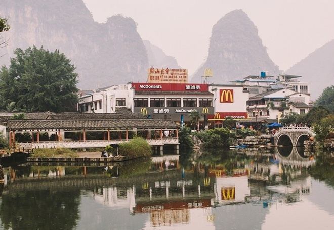 McDonald’s, Yangshuo, Trung QuốcYangshuo là thành phố có nhiều trường học bằng tiếng Anh nhất tại Trung Quốc. Đây cũng là thiên đường cho du khách nước ngoài muốn đi bụi và leo núi. Cũng vì vậy mà thành phố này là điểm đến hấp dẫn của các chuỗi ăn nhanh Mỹ như KFC và McDonald’s. Cửa hàng McDonald’s ở đây được thiết kế kết hợp với kiến trúc phương Đông của Trung Quốc, nằm bên hồ nước thơ mộng. Thực khách có thể dùng bữa trong một ngôi chùa. |