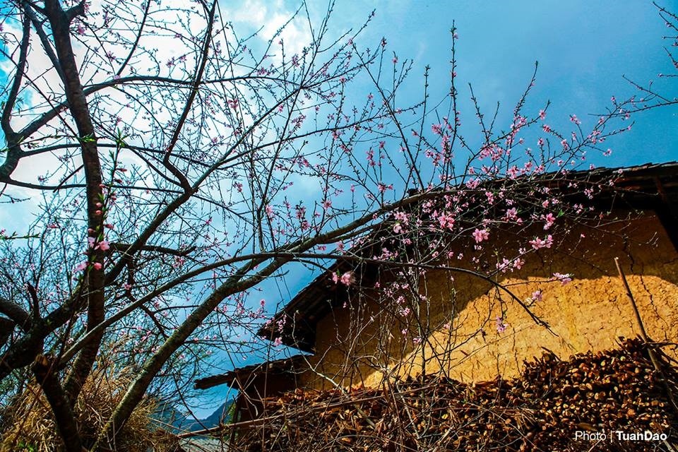 | Hà Giang đẹp vào mọi mùa trong năm. Mùa xuân, các ngôi nhà tường trình nổi bật trên nền trời xanh thẫm, bên các cây hoa đào đang khoe sắc rực rỡ. |