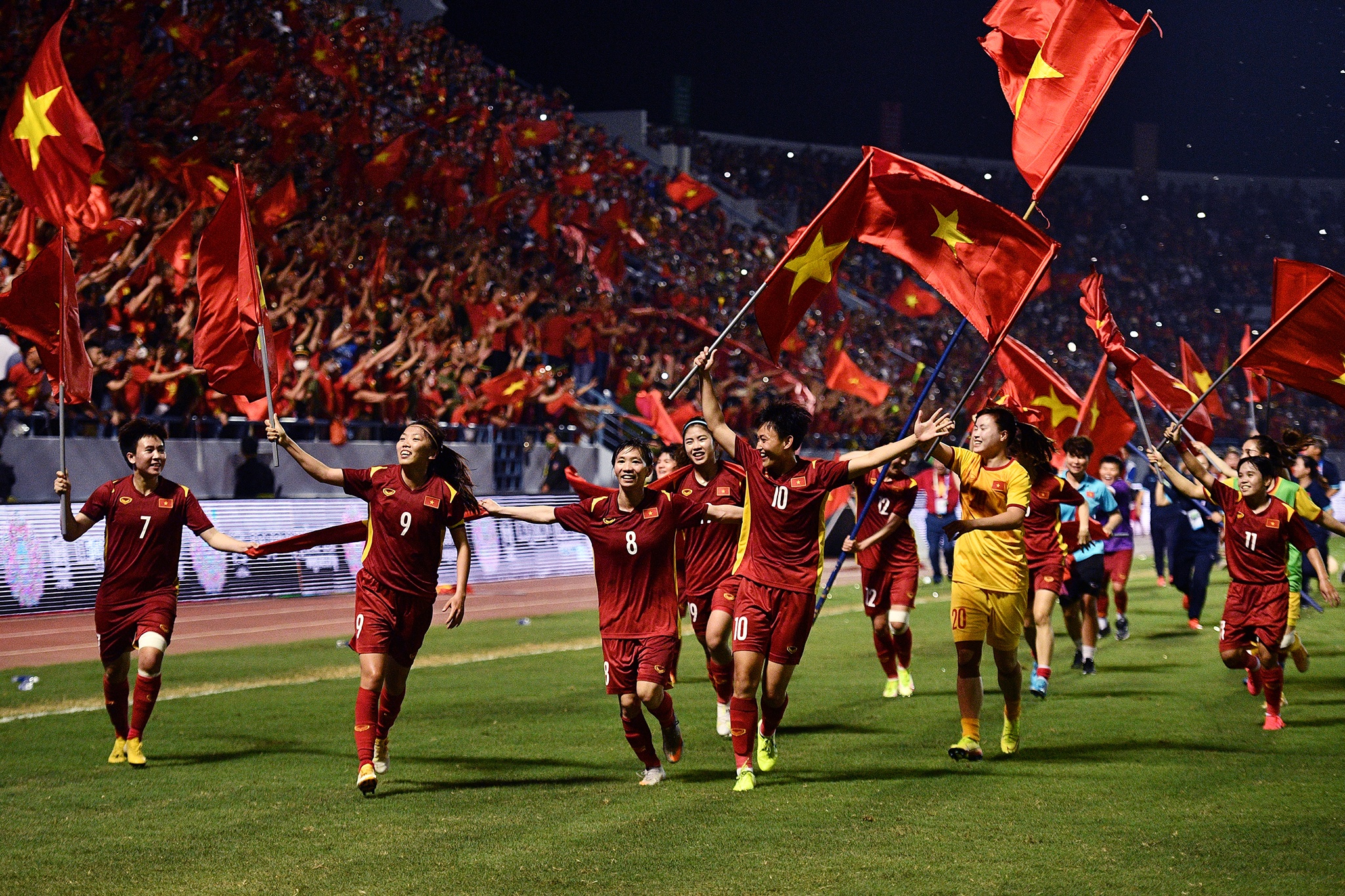 Toàn bộ ban huấn luyện và các cầu thủ nữ Việt Nam trên sân Cẩm Phả đã có những khoảnh khắc đẹp khó quên sau chiến thắng 1-0 trước Thái Lan ở chung kết SEA Games 31 tối 21/5. Ảnh: Hoàng Hà.