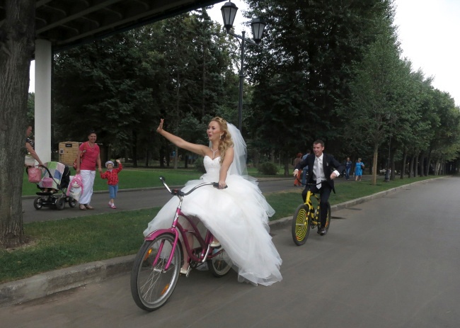 Một chú rể khác toát mồ hôi đạp xe theo cô dâu.