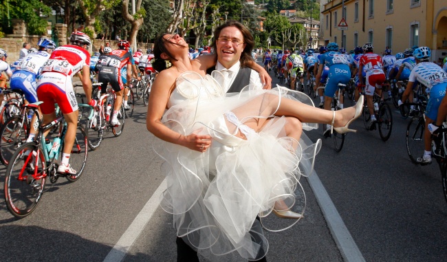 Chú rể bế cô dâu giữa cuộc đua xe đạp.