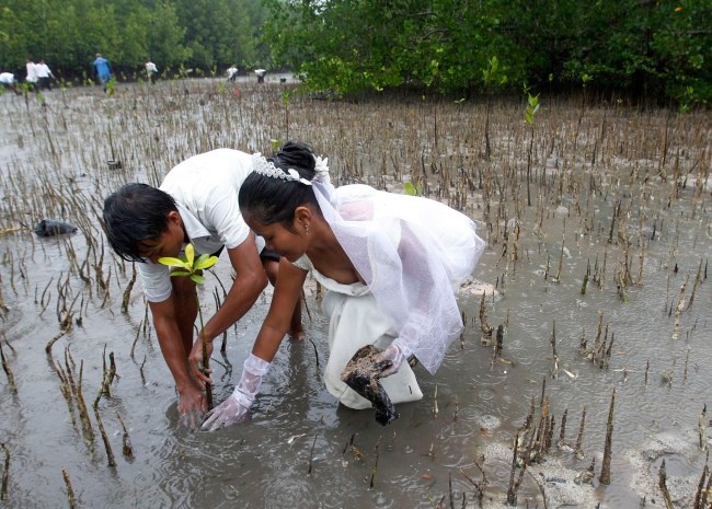 Cô dâu chú rể cùng nhau đi trồng cây gây rừng trong ngày cưới.