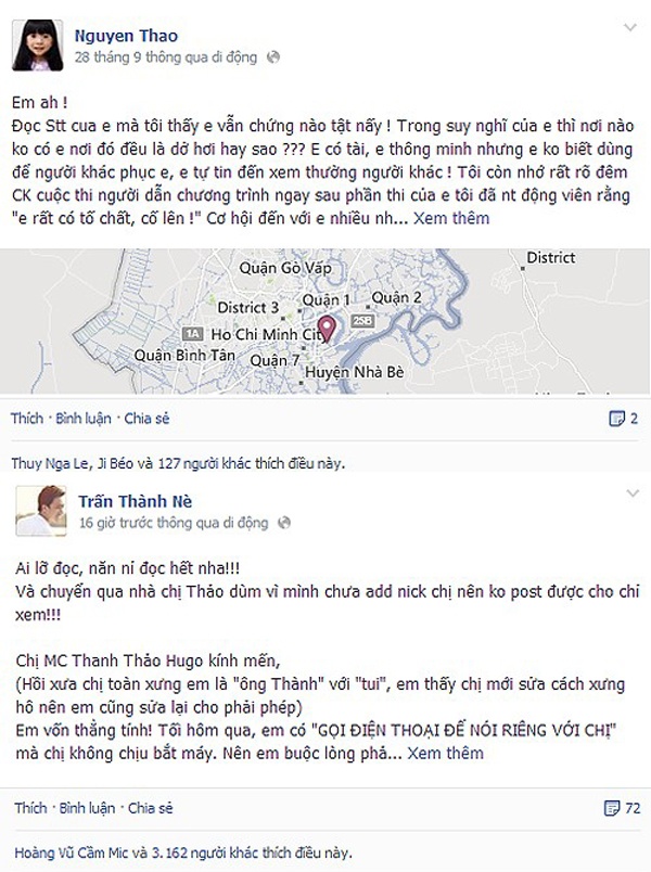 | Cách đây không lâu, cộng đồng mạng Facebook không khỏi “mỏi mắt” khi đọc những bức tâm thư qua lại giữa 2 MC nổi tiếng Trấn Thành và Thanh Thảo. Sự việc bắt nguồn từ lời góp ý của Thanh Thảo về cách dẫn chương trình của Trấn Thành sau đêm chung kết 2 cuộc thi "Người dẫn chương trình truyền hình", trong đó nữ MC của Vui cùng Hugo và Vietnam Idol nhận xét đàn em là người “tự tin đến mức xem thường người khác”, “ảo tưởng về khả năng của bản thân”, “huyên thuyên trong micro như một đứa trẻ già trước tuổi” và khiến các MC phải e dè khi họ phải dẫn cùng anh. |