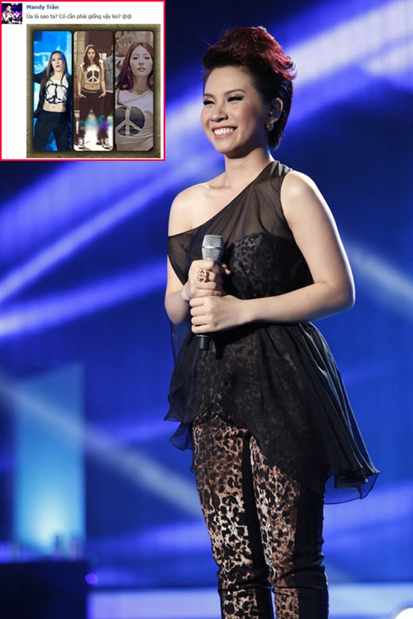 | Trong thời điểm, Vietnam Idol 2012 đang gây chú ý, một thí sinh của cuộc thi là Thanh Trúc - người bị loại ở top 9 đã có hành động bị coi là nói xấu ban giám khảo – ca sĩ đàn chị Mỹ Tâm. Trên trang cá nhân, Thanh Trúc đăng tải hình ảnh Mỹ Tâm trình diễn trong đêm công bố kết quả với bức ảnh nữ ca sĩ Hàn Quốc BoA và dòng chú thích: “Ủa là sao ta? Có nhất thiết phải giống vậy không?”, ám chỉ Mỹ Tâm bắt chước trang phục của BoA. |