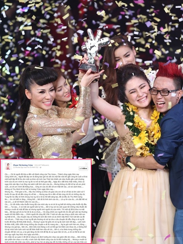 | Dường như chưa hiểu được hết câu trả lời của Thu Minh, Hương Tràm đã có hành động khá nông nổi. Cô lên trang cá nhân viết bức tâm thư khá dài, trong đó cô tự nhận bản thân không đủ khéo léo để phát triển mối quan hệ thân thiết với vị HLV cũ, đồng thời bóng gió tiết lộ mâu thuẫn trong đội Thu Minh, Hương Tràm cũng không quên ghi nhận nhờ có đàn chị cô mới có được thành công như ngày hôm nay… |