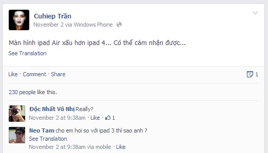 | Cảm nhận cá nhân cho thấy iPad Air có chất lượng hiển thị không tốt bằng phiên bản cũ. |