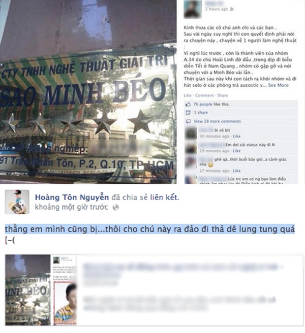 | Chỉ 2 ngày sau, nam ca sĩ trẻ Hoàng Tôn hé lộ anh từng nghe 2 người em trong nghề kể về chuyện Minh Béo gạ tình họ, tiếp đó trên trang cá nhân của đạo diễn, biên kịch phim ngắn Xin lỗi! Anh chỉ là thằng bán bánh giò cũng chia sẻ câu chuyện tương tự như N.H cùng nhiều cư dân mạng khác. |