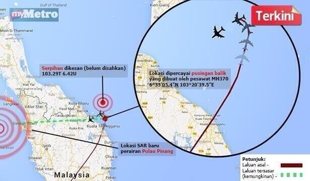 | Malaysia tình nghi chuyến bay số hiệu MH370 quay đầu trước khi mất tích. Ảnh: Metro. |