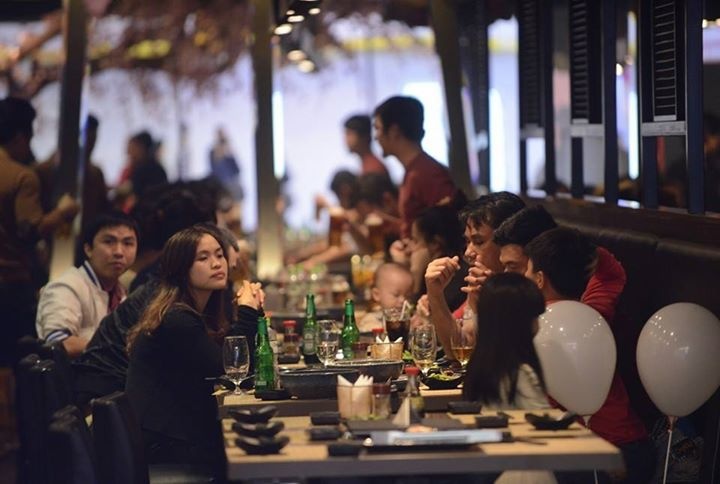 Tối 7/3 trùng vào ngày cuối tuần, nhiều người tổ chức ăn mừng 8/3 sớm. Tại trung tâm thương mại Royal City trên phố Nguyễn Trãi (quận Thanh Xuân, Hà Nội), lúc gần 20h, các quán nhậu đều đông khách. Một số chủ nhà hàng tại đây cho hay, từ 19h, khách bắt đầu đổ về khu ẩm thực rất đông. Nhiều nhân viên tại các khu ăn uống làm không xuể việc. Ảnh: Lê Hiếu. |