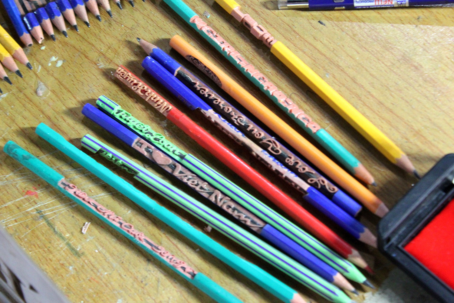 | Một bạn sinh viên tại làng đại học Quốc gia TP.HCM đã mở dịch vụ khắc tên lên bút chì. Những chiếc bút chì rẻ tiền phút chốc trở thành những món quà giá trị. Giá khắc là 4.000 đồng/chữ. |