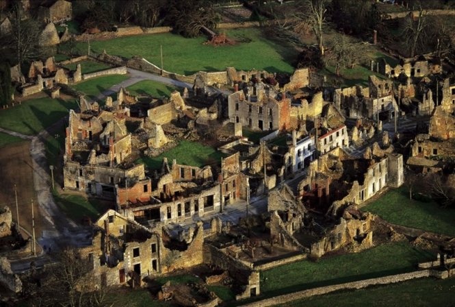 | 12. Ngôi làng ma ám Oradour-sur-Glane, Pháp: Ngày 10/6/1944, một trung đội của Đức quốc xã tiến vào ngôi làng Oradour-sur-Glane để chiếm đóng và thảm sát 642 cư dân. Trong buổi sáng, cả ngôi làng bị phong tỏa. Đàn ông bị tách ra trong sáu chuồng, rồi bị xả súng bắn và tẩm xăng thiêu sống. Còn phụ nữ và trẻ em bị nhốt trong một nhà thờ và cũng bị thiêu sống, không một ai thoát ra được. |