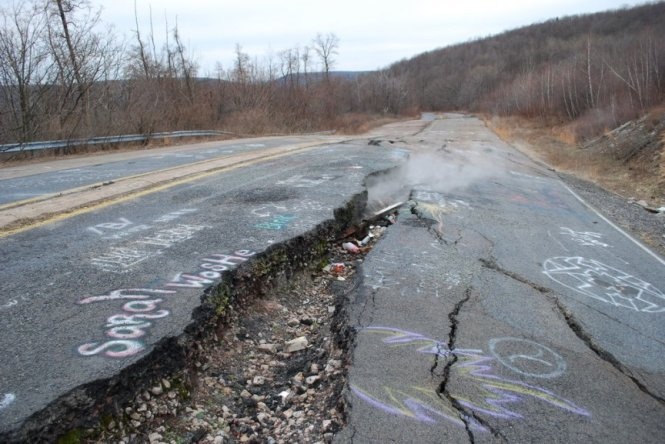 | 7. Thị trấn ma Centralia ở Pennsylvania, Mỹ: Nếu đã từng xem bộ phim Silent hill, bạn sẽ thấy nơi này rất quen. Từ 1.000 dân vào năm 1981 chỉ còn 10 người vào năm 2010 và bây giờ Centralia được coi là một thị trấn ma. Năm 1962 đã xảy ra một vụ cháy ở dưới các mỏ của thị trấn, kết quả mặt đất bị rung chuyển, các khe nứt lớn xuất hiện và các tòa nhà bị sụp đổ. |