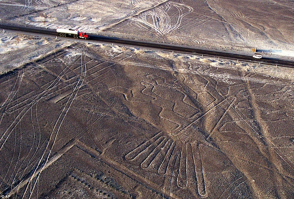 Năm 2009, nước chảy xuống từ đường cao tốc Pan-America gần đó sau mưa lớn đã làm trôi một hình vẽ. Một số bị phá hủy do hoạt động khai thác mỏ. Trong ảnh, đường cao tốc đi xuyên qua những hình vẽ bí ẩn ở Peru. |