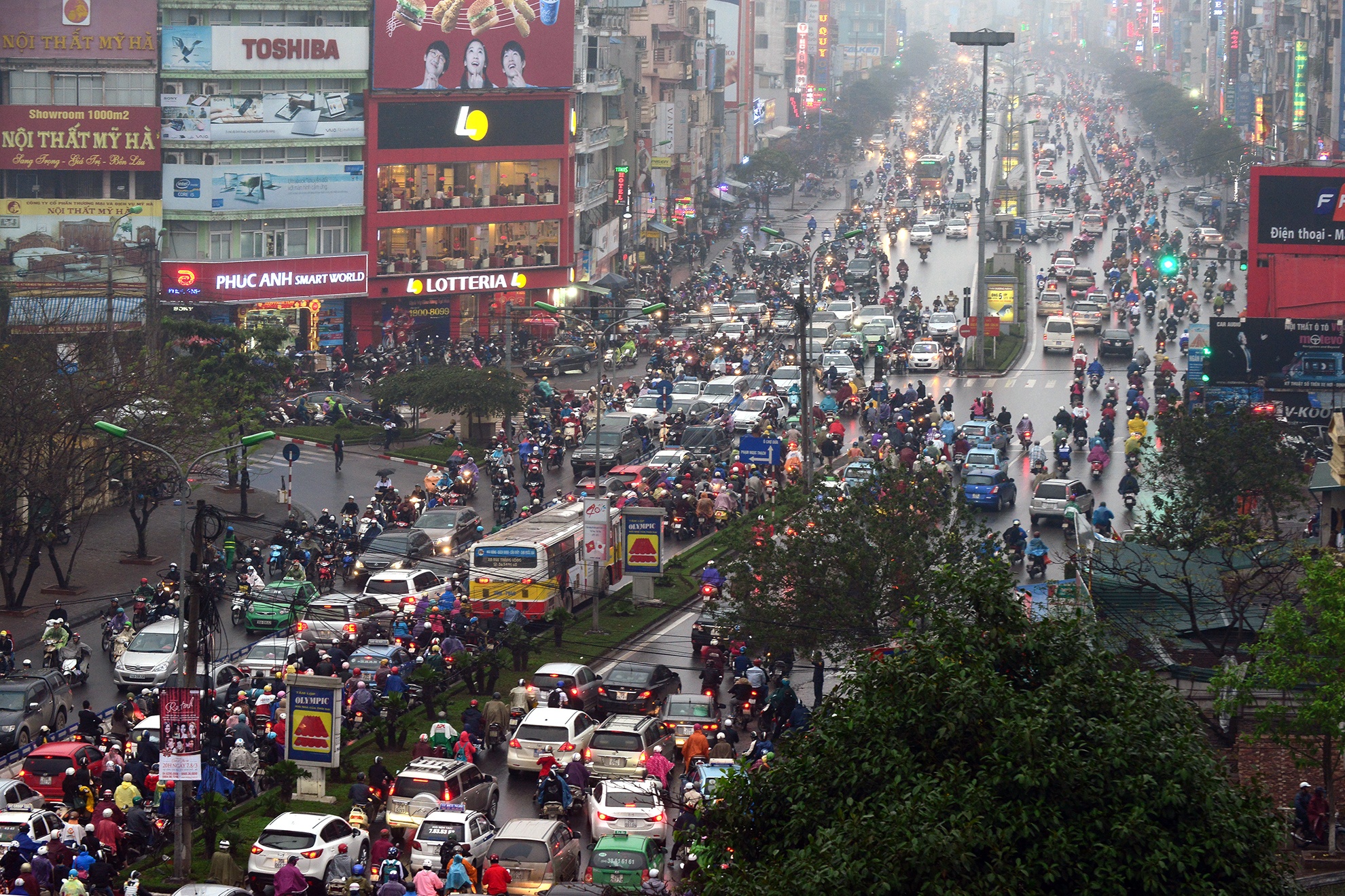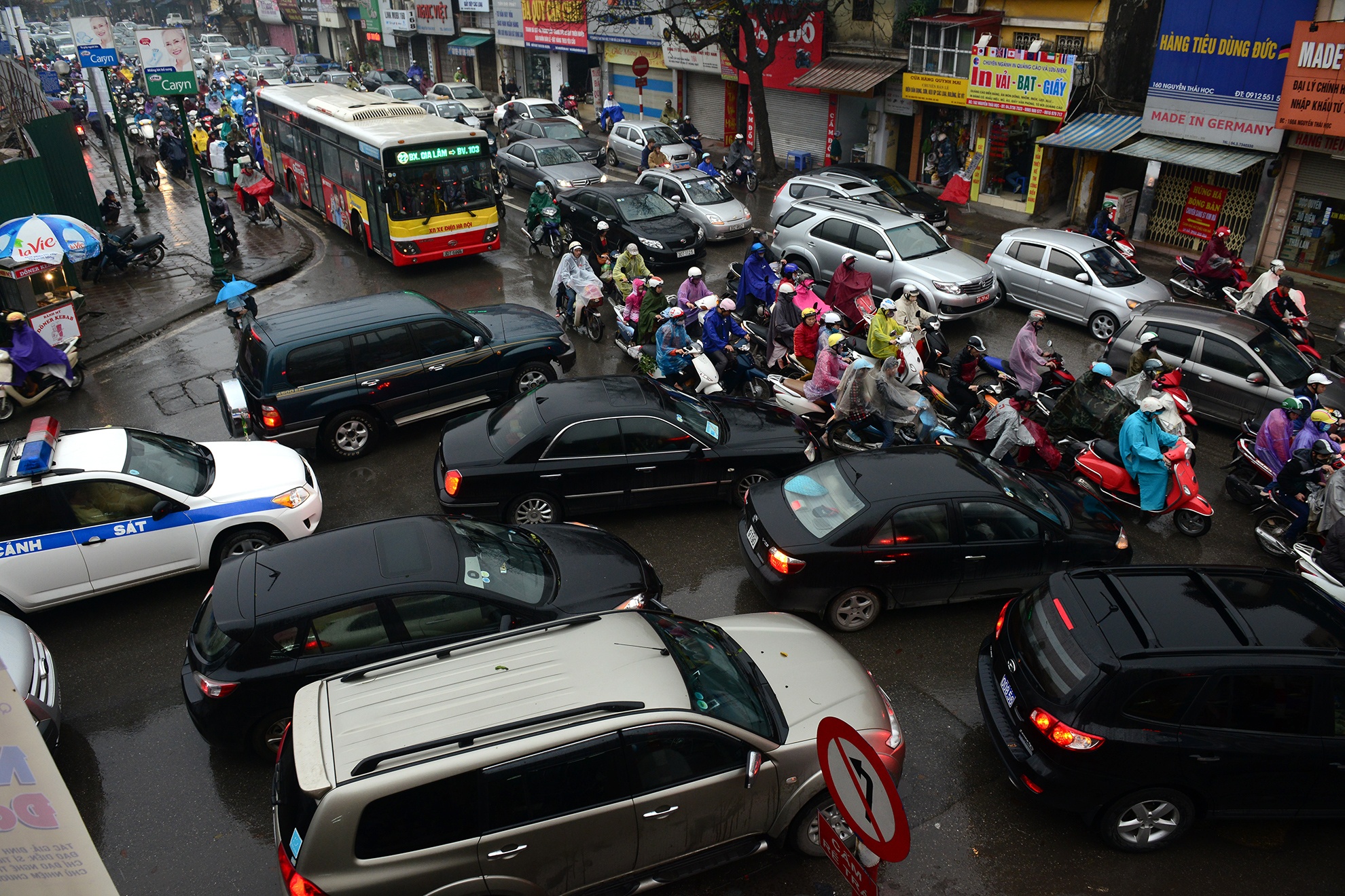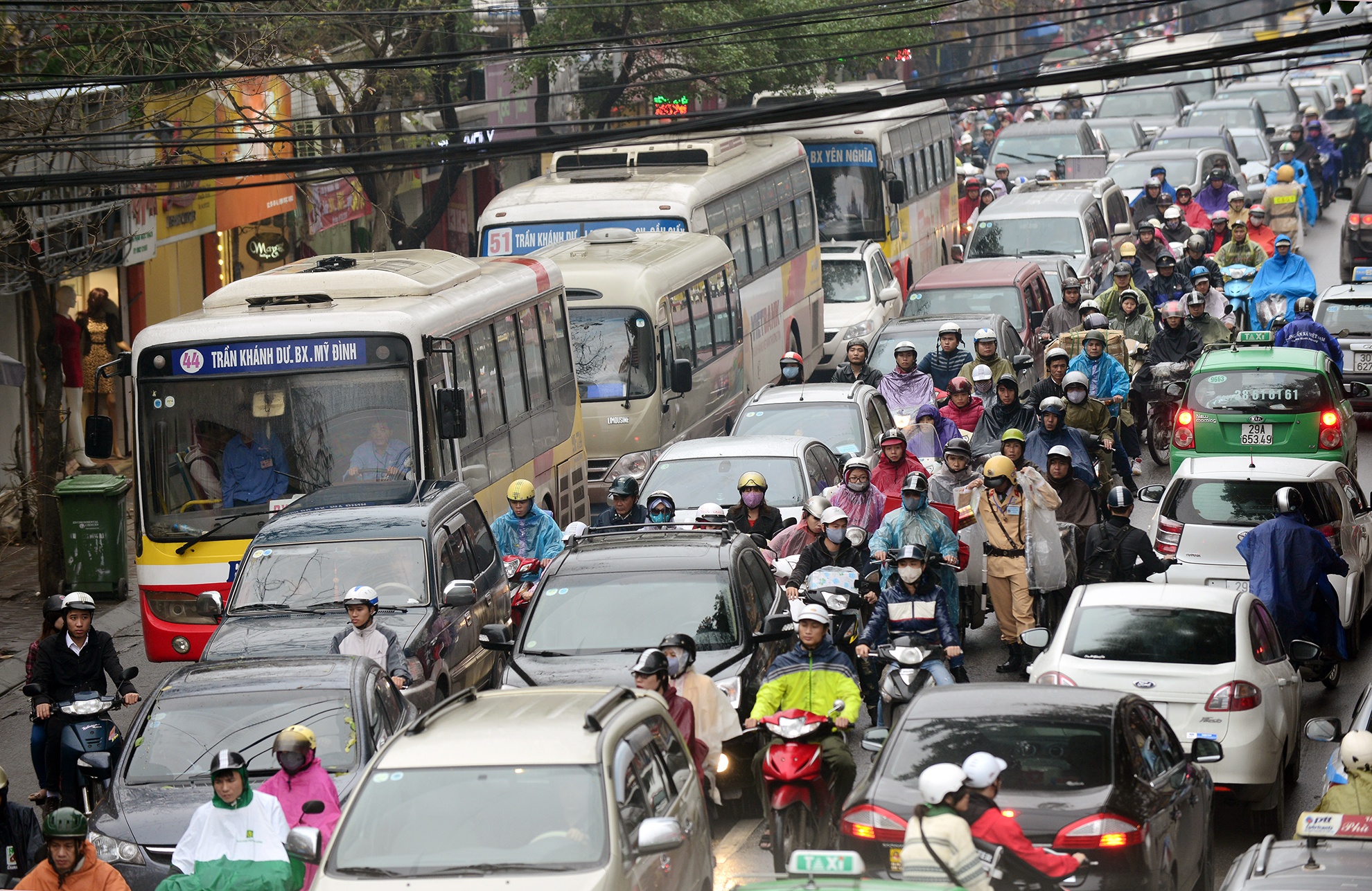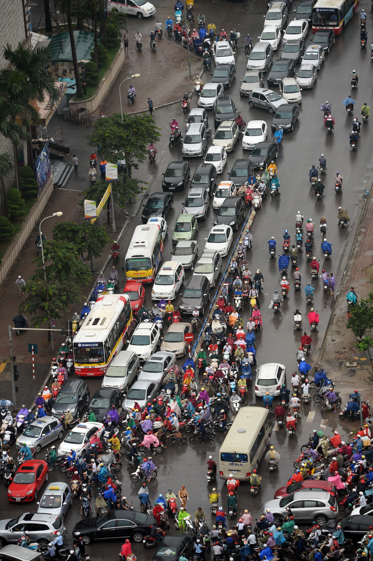 7h15 đến 8h sáng hàng ngày, ở nút giao thông Trần Duy Hưng - Hoàng Minh Giám - Nguyễn Chánh, hễ trời mưa là giao thông ùn ứ, không xe nào chịu nhường xe nào. |