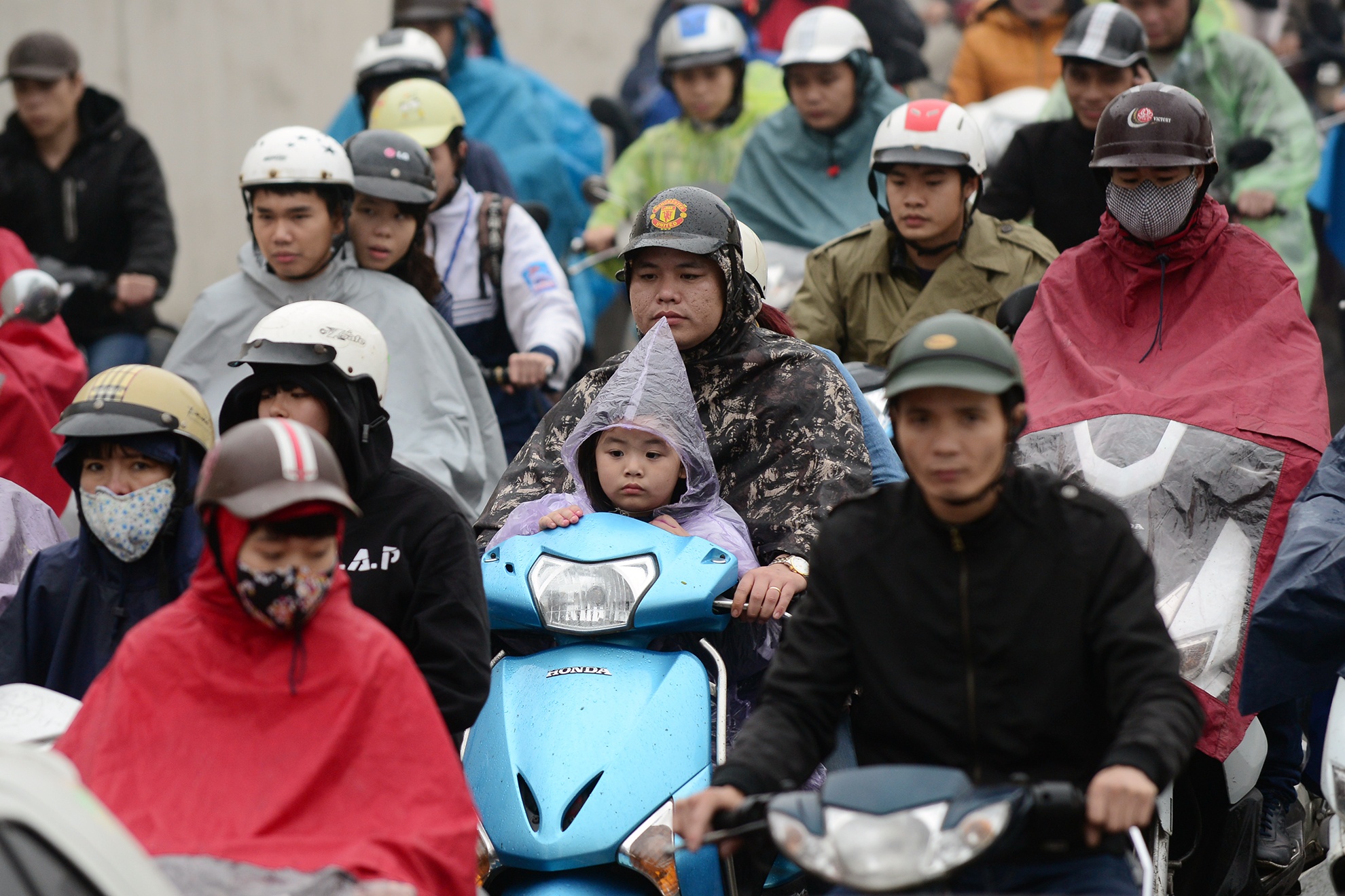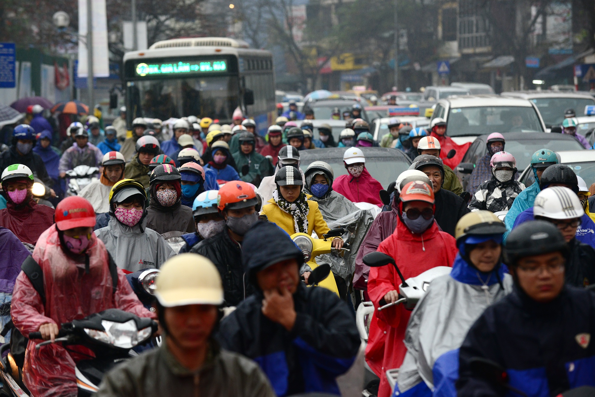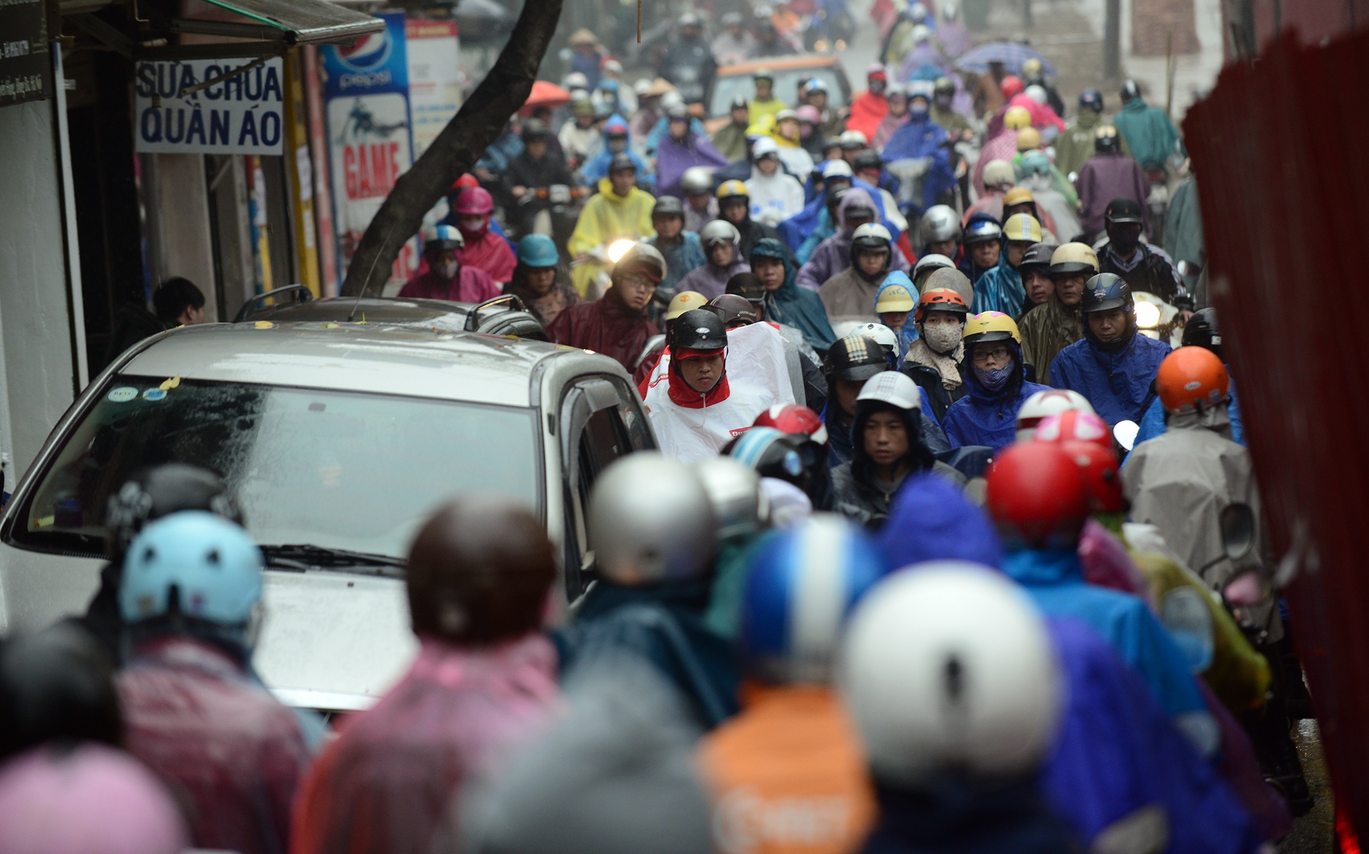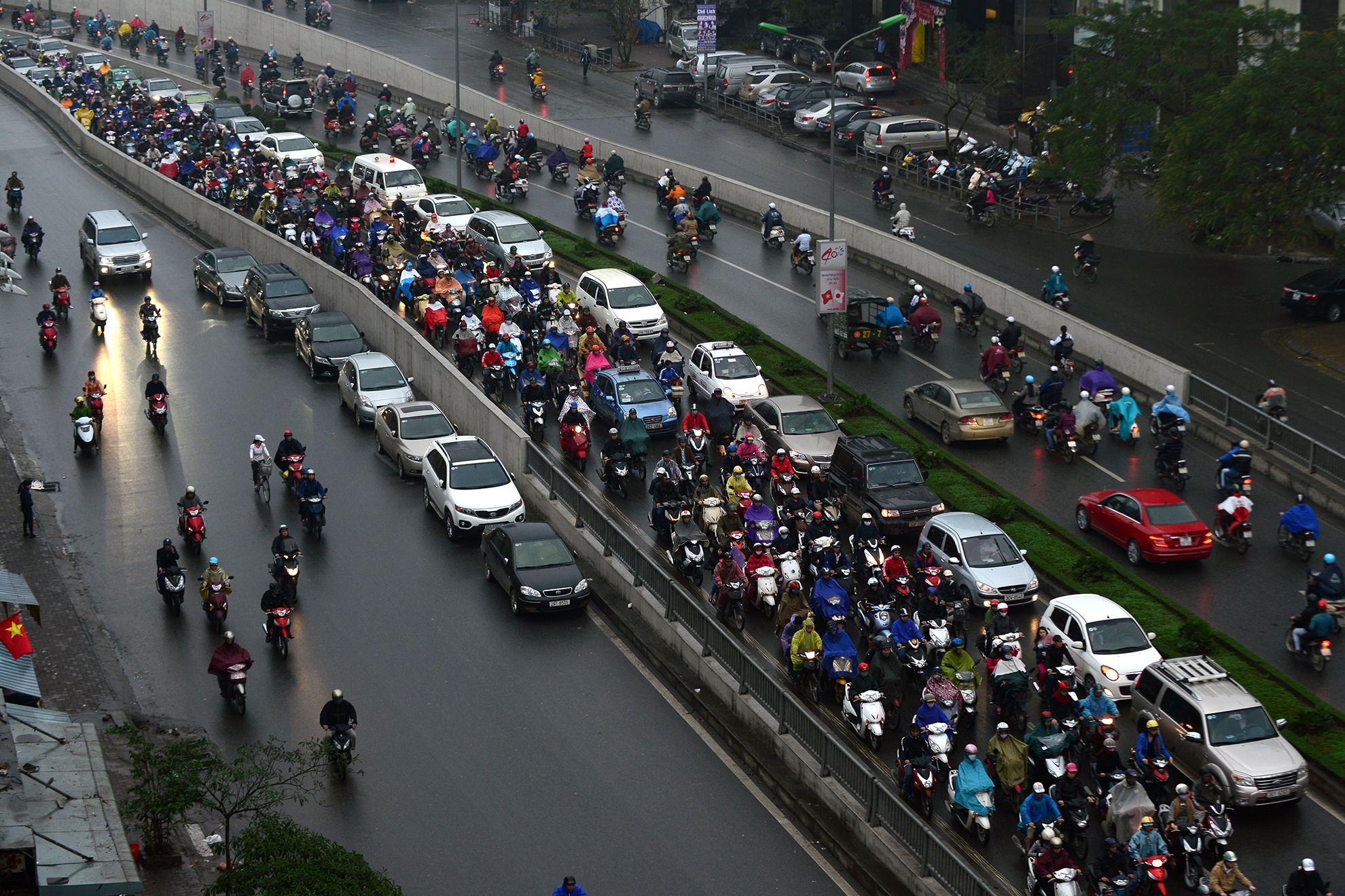 | Mưa ướt, người đi xe máy phải chen lấn trong làn đường của mình với xế hộp. |