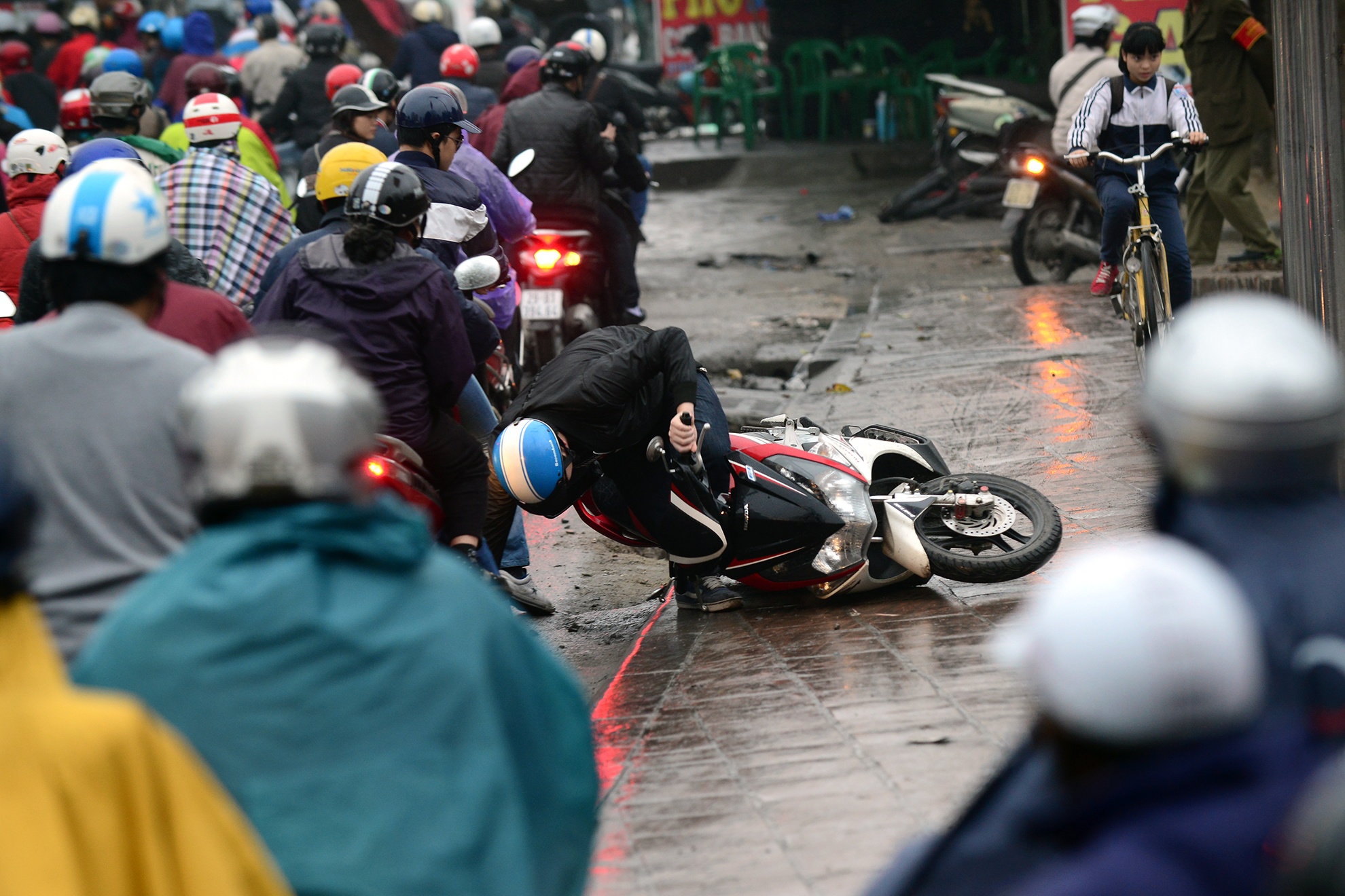 | Một thanh niên leo vỉa hè ngược chiều bị trơn trượt ngã lăn kềnh trên đường Đào Duy Anh. |