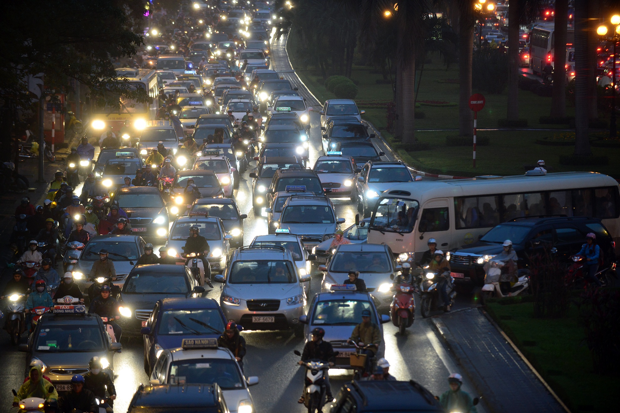 | Nút giao Kim Mã - Cát Linh - Nguyễn Thái Học hướng vào trung tâm thành phố ngày thường luôn ùn tắc trong khoảng thời gian 7h đến 8h. Khi có mưa, tình trạng lại càng trầm trọng. |