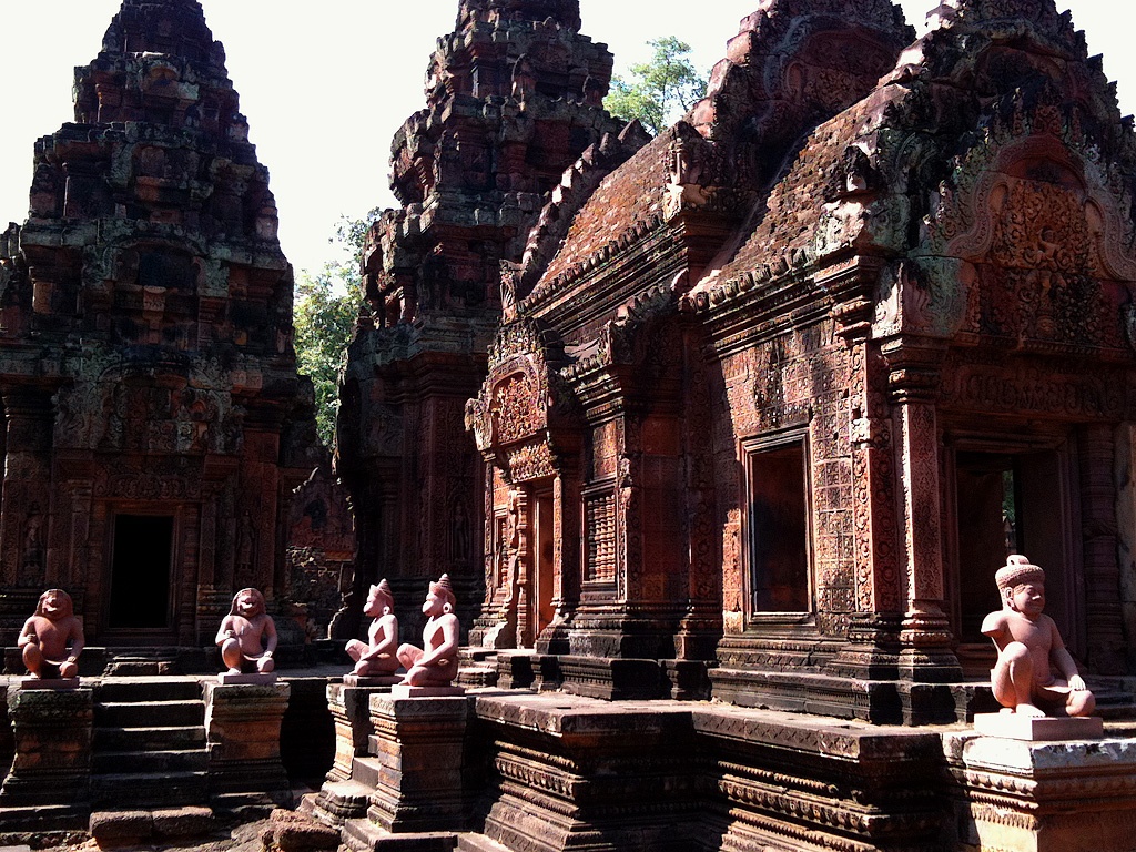 8. Banteay Srei là một đền thờ nằm cách quần thể Angkor 25 km về phía đông bắc. Công trình được xây dựng từ năm 967 bằng đá sa huỳnh đỏ. Nơi đây nổi bật với nhiều kiệt tác điêu khắc trang trí trên đá tuyệt đẹp. Ảnh: Nguyentienquang.