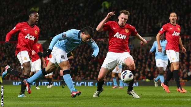 | Aguero gây khó khăn cho hàng thủ MU. |
