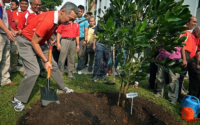 | Thủ tướng Lý Hiển Long trồng cây trong ngày truyền thống. Ảnh: Straitstimes |