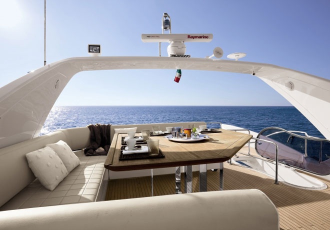 Du thuyền này được sản xuất tại Italy, có chiều dài 22 m, gây ấn tượng bởi đây là sản phẩm kết hợp tinh tế giữa nghệ thuật thiết kế đương đại và những công nghệ tiên tiến của ngành chế tạo du thuyền trên thế giới. Du thuyền có động cơ 2.720 mã lực, bình nhiên liệu 4.800 lít, bình chứa nước ngọt 1.200 lít. Ảnh: Lao động.