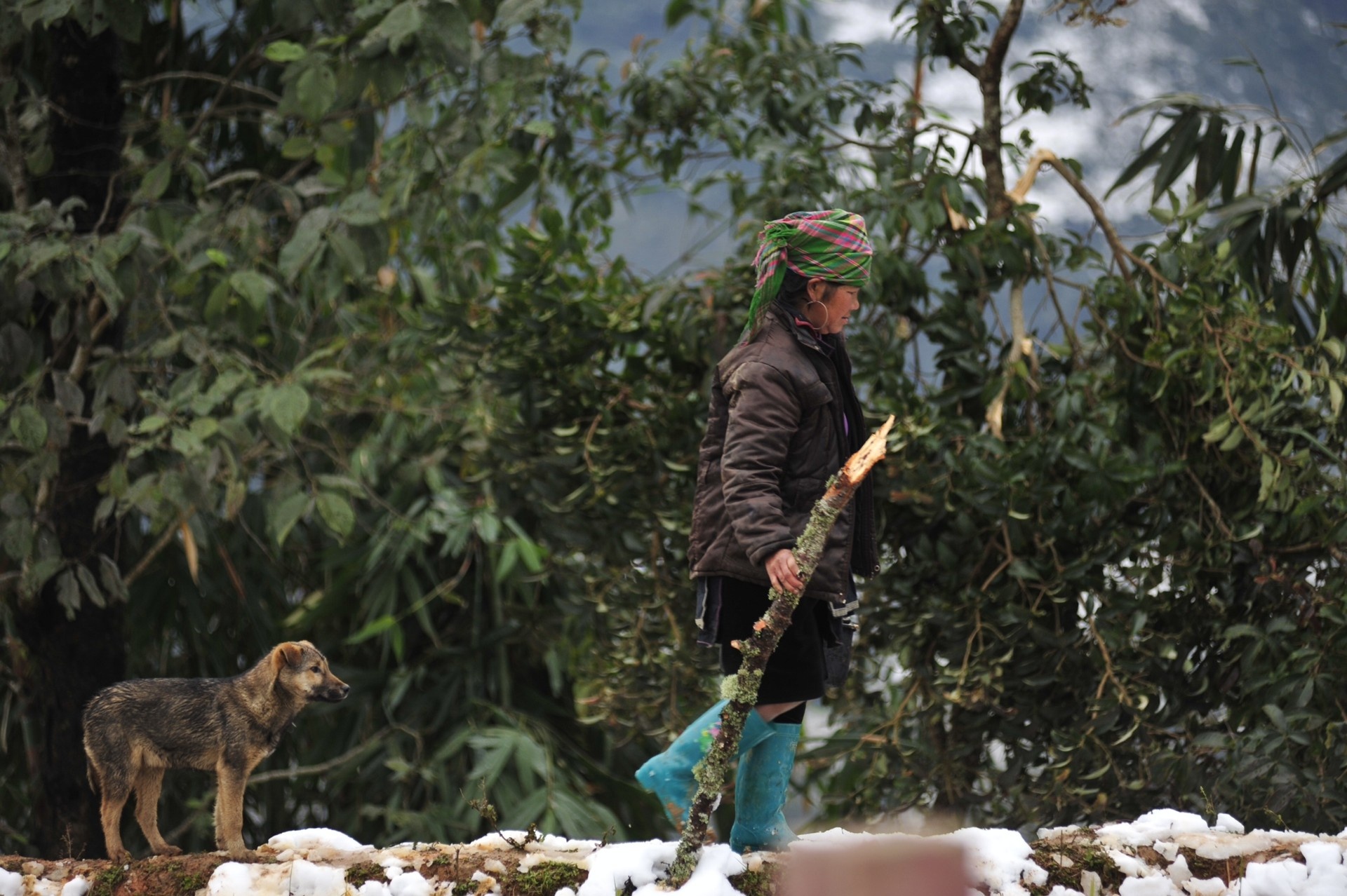 | Người phụ nữ phải đi ủng trên mép ruộng bậc thang và dùng cây gậy để chống để khỏi trơn. |