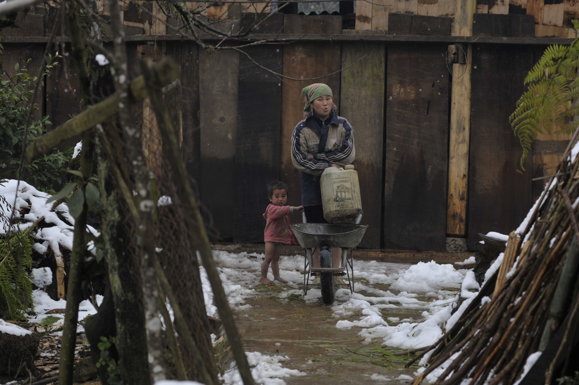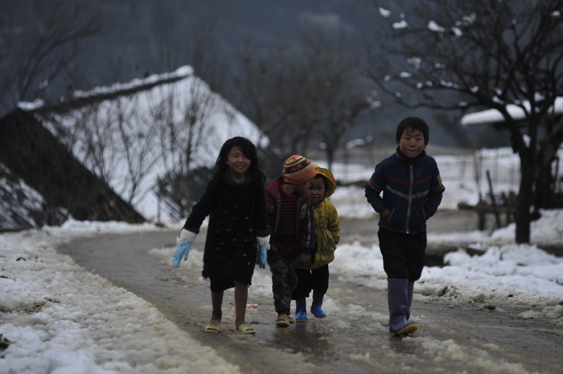 | Đường xá trơn trượt, cây cối bị tuyết bám đổ xuống đường, dưới cái lạnh 3 - 4 độ C, mà quần áo của những đứa trẻ cũng không thật ấm. |