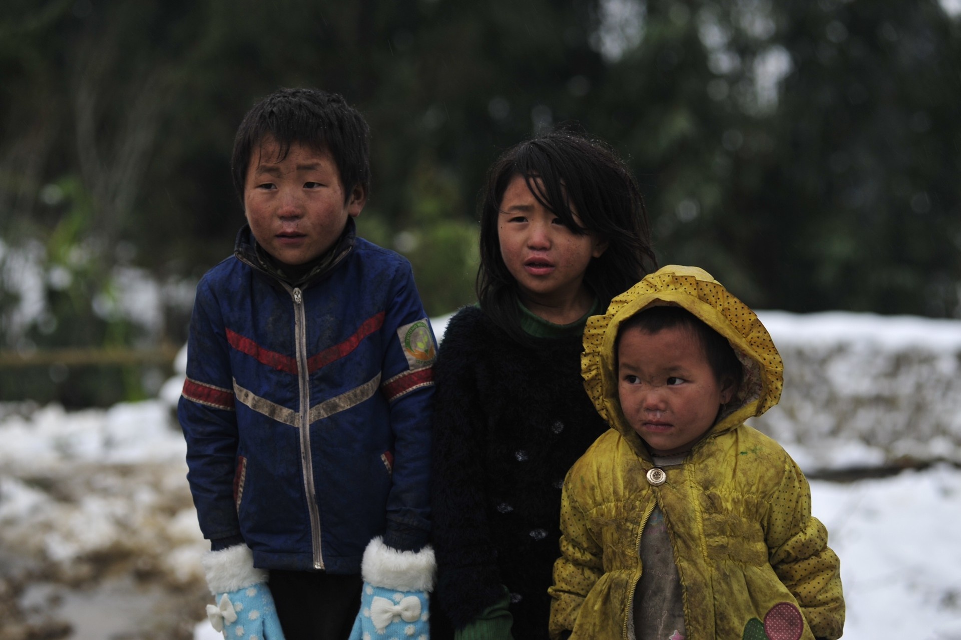 | Những em bé co ro bên đường, mặt tím tái vì gió lạnh. |