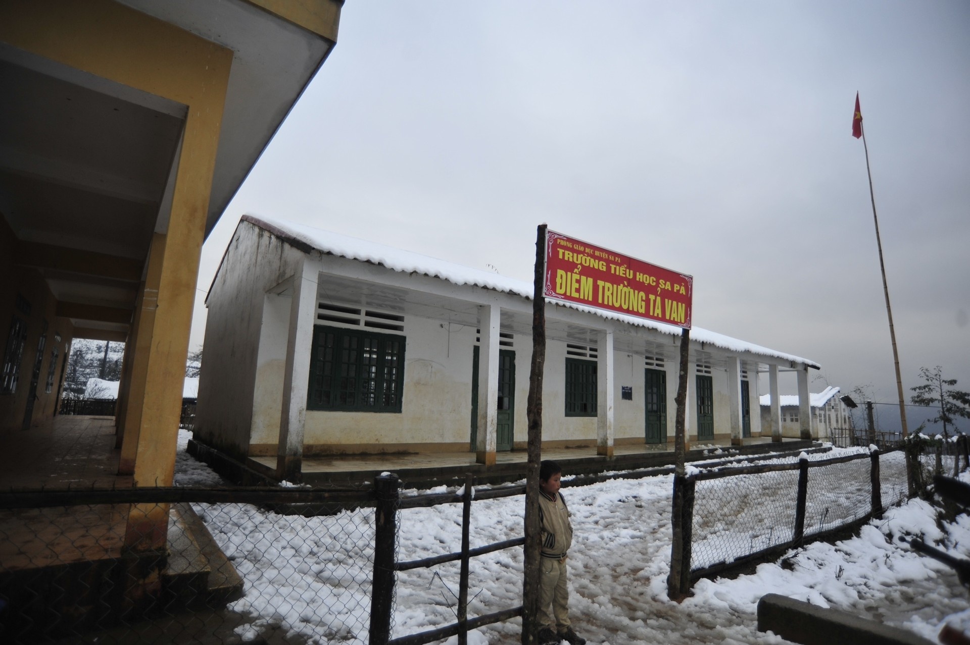 | Cậu bé tần ngần nhìn xa xăm trước cổng ngôi trường mà tuyết đã bao phủ dầy đặc mái và sân trường. |