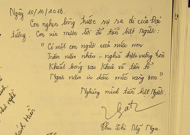 | "Chúng con người lính 1966 tưởng nhớ và thương tiếc Đại tướng vô cùng. Hứa với Đại tướng, chúng con sống và hành động với tư cách người lính Cụ Hồ và là quân của Đại tướng." - Hoàng Thị Tuyến. |