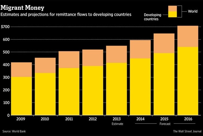 | Biểu đồ ước tính và dự báo về lượng kiều hối đổ về các nước đang phát triển (phần màu vàng) và cả thế giới (cả phần màu vàng và màu cam). |