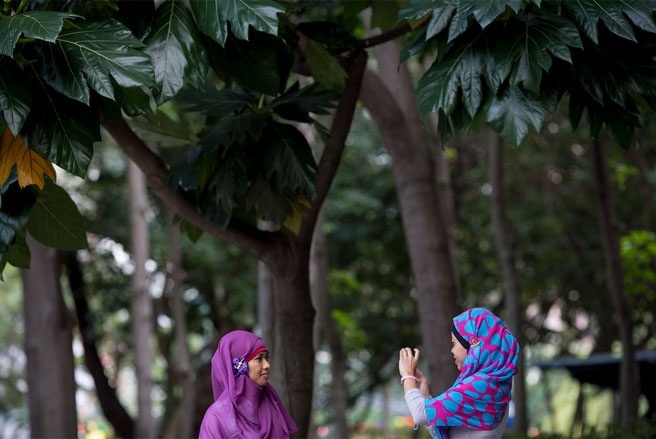 | Trong ngày nghỉ, hai nữ lao động giúp việc nhà người Indonesia ở Hồng Kông chụp ảnh cho nhau. Ở Hồng Kông hiện có khoảng 270.000 lao động nhập cư làm nghề giúp việc. Trung bình, mỗi người giúp việc nhập cư từ Indonesia, chi phí để được sang Hồng Kông làm việc là 2.708 USD, bằng khoảng 5 tháng lương, theo số liệu của WB. |