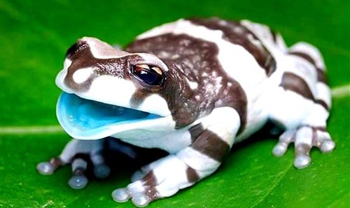 | Ếch sữa với thân hình màu trắng như sữa kèm theo những vạch nâu đen, cái miệng màu xanh nước biển. |