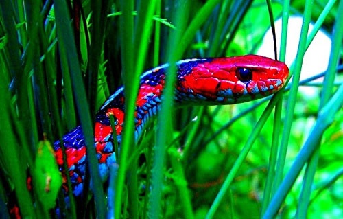 | Một con rắn sọc đỏ đang ngụy trang để săn mồi. |