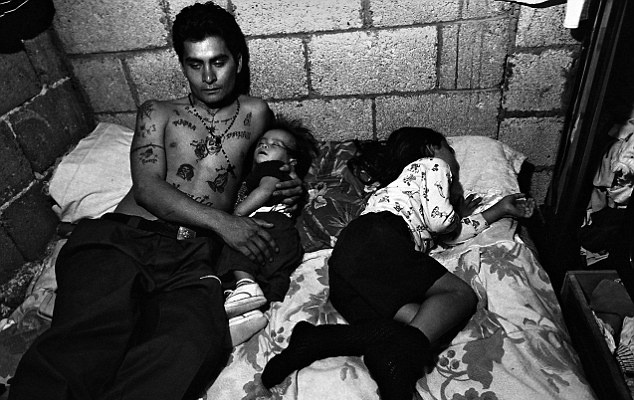 | Một thành viên băng đảng mong muốn bỏ cuộc sống giang hồ đang ôm đứa con nhỏ trong lòng. Anh ta rất lo lắng cho tương lai vì hình xăm trên người sẽ khiến anh khó hòa nhập với xã hội và khó tìm việc. Ảnh: Donna De Cesare. |