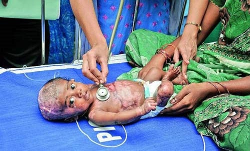 Dù mới 3 tháng tuổi nhưng bé Rahul bị bỏng khắp người. |