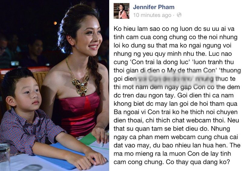 | Mối quan hệ của cặp đôi một thời hậu ly hôn cũng không tới mức “cạch mặt nhau”, cho tới tháng 8 năm ngoái, Jennifer Phạm bất ngờ đăng tải lên Facebook cá nhân chỉ trích Quang Dũng không làm tròn trách nhiệm của một người cha. Trong đoạn trạng thái status, Jennifer Phạm kể tội chồng cũ ít quan tâm tới Bảo Nam, hiếm khi dành thời gian để gặp con trai và sử dụng hình ảnh con trai để lấy lòng công chúng. |