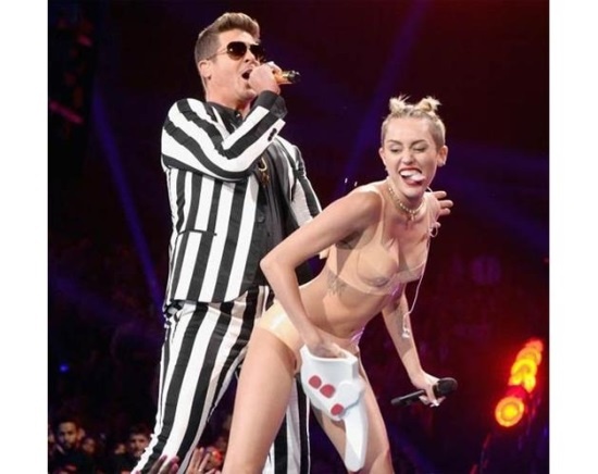 Tuy nhiên đỉnh điểm để mọi người đặt cho cô biệt danh "gái hư" lại xuất phát từ màn trình diễn phản cảm tại MTV Video Music Award. Cô cùng với bạn diễn Robin Thicke đã gây sốc theo đúng nghĩa khi trình diễn những vũ điệu còn hơn cả phim cấp 3 trong sự vui cười như không có gì. Cô còn lè lười khiêu khích khi biểu diễn và chưa kể, Robin Thicke là người đã có gia đình.
