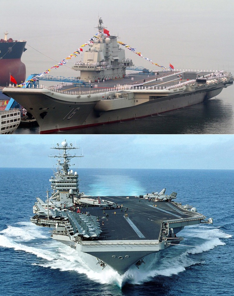 | Tàu sân bay Liêu Ninh của Trung Quốc (trên) và Tàu sân bay USS George Washington của Mỹ (dưới). Ảnh: Wiki |