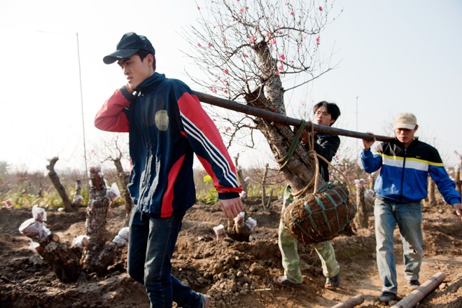 | Thời điểm này các vườn đào tại làng hoa nổi tiếng thủ đô đang nhộn nhịp cảnh gánh gồng, vận chuyển. |