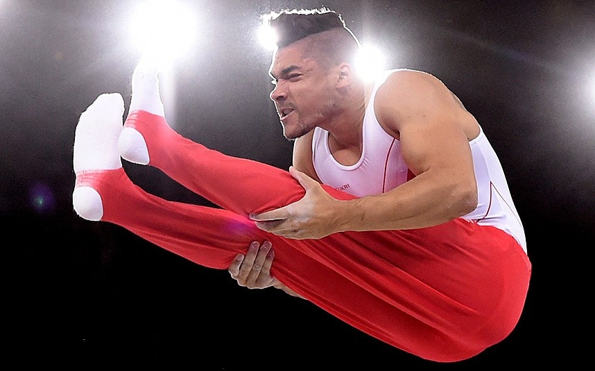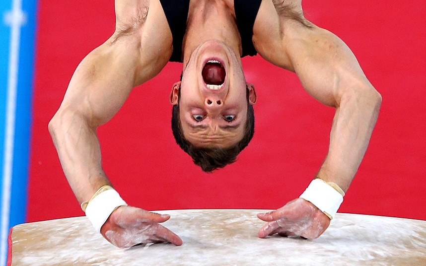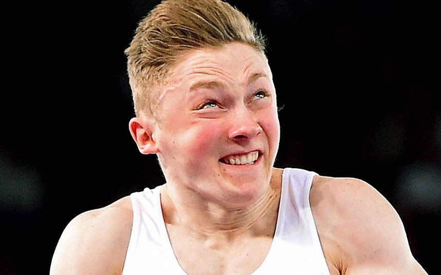 | VĐV Louis Smith của Anh nghiến răng nheo mắt trong khi chinh phục tấm HCV ở môn thể dục dụng cụ. |