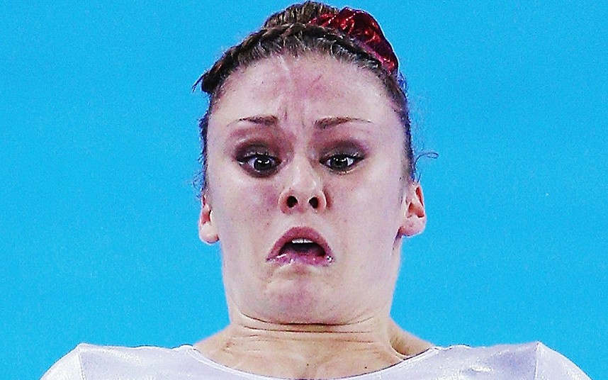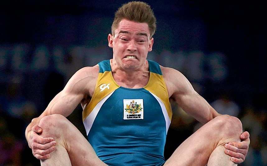 | Gương mặt của VĐV thể dục dụng cụ Sean OHara (Australia) khi tiếp đất. |