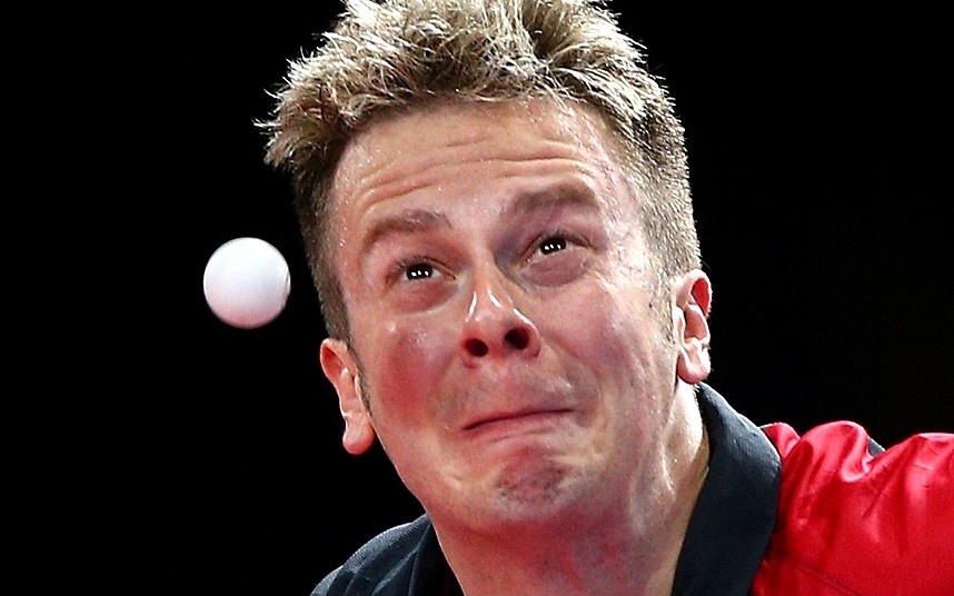 | Không hiểu Andrew Baggaley (VĐV bóng bàn người Anh) đang nhìn đi đâu khi trái bóng ngay trước mặt anh. |