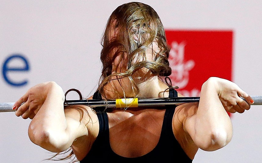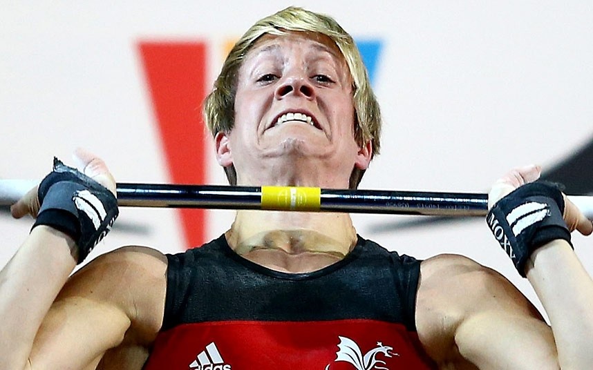 | Nữ VĐV Michaela Breeze của xứ Wales trong lúc thực hiện bài thi cử tạ hạng cân 58 kg. |