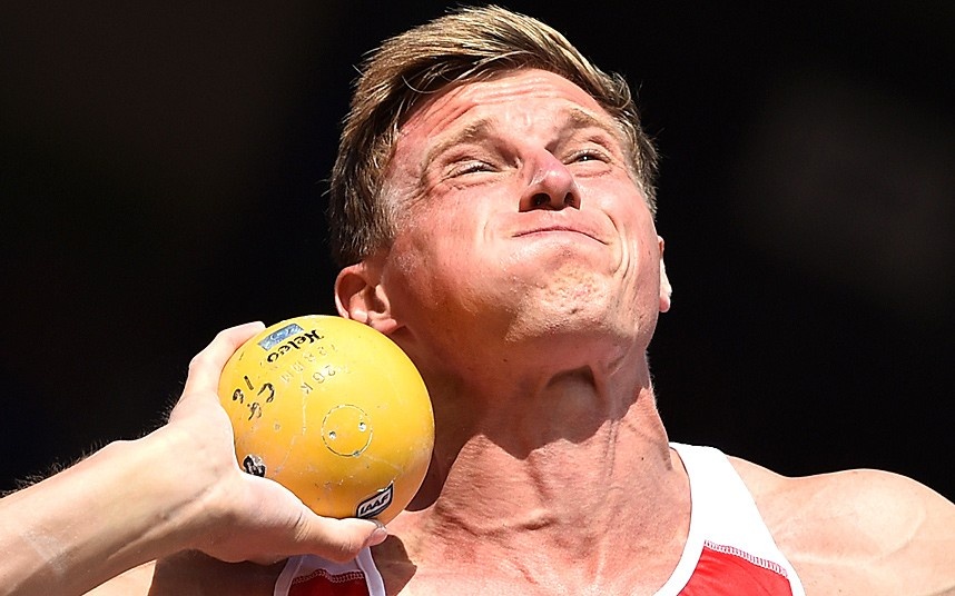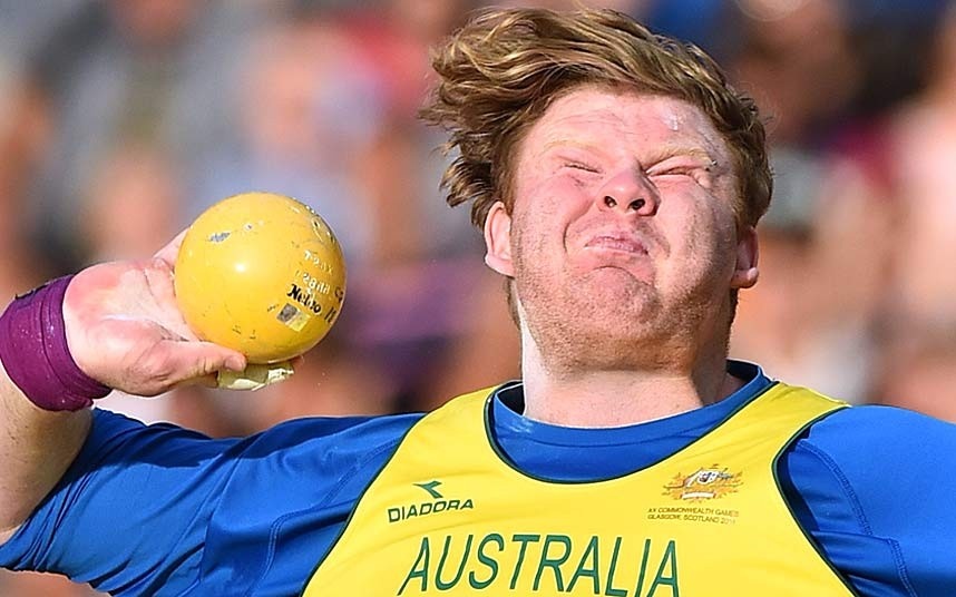 | Không rõ Damien Birkinhead (Australia) sẽ ném quả tạ ra hướng nào khi mắt anh nhắm tịt lại. |