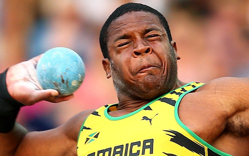 | Các VĐV ném tạ thường có điểm chung là nhắm tịt mắt khi vung tay. Trong hình là CĐV O'dayne Richards của Jamaica. |
