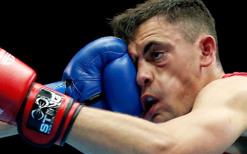 | Kieran Smith (Scotland) tung cú đấm thép thẳng vào mặt đối thủ người Anh, Antony Fowler ở nội dung quyền anh hạng trung. |