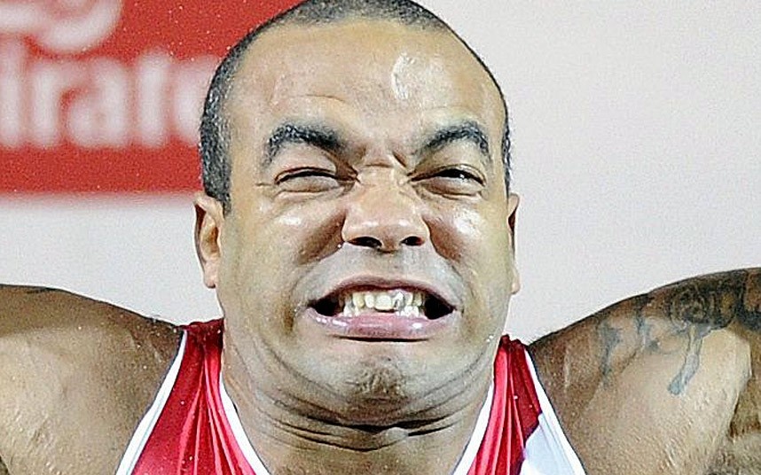 | Mắt và mồm của VĐV ném tạ Martin Brockman (Anh) biến dạng. |