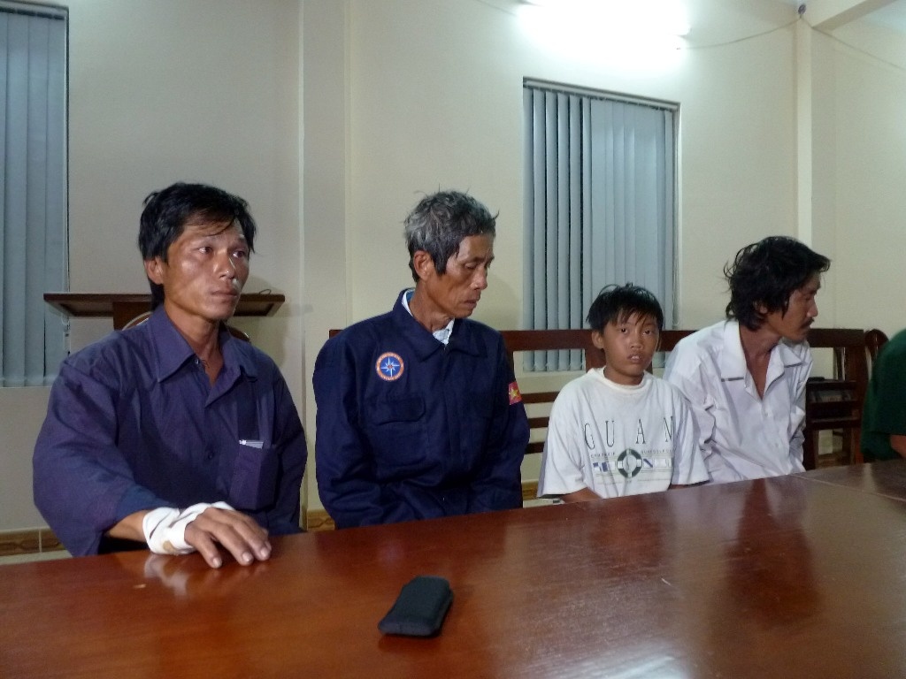 | Bốn ngư dân gặp nạn (từ trái sang) anh Nguyễn Văn Thanh, ông Võ Văn Nhiệm, em Nguyễn Văn Bé (con anh Thanh) và anh Nguyễn Văn Hồng trong hội trường trung Trung tâm phối hợp tìm kiếm cứu nạn hàng hải KV3. |